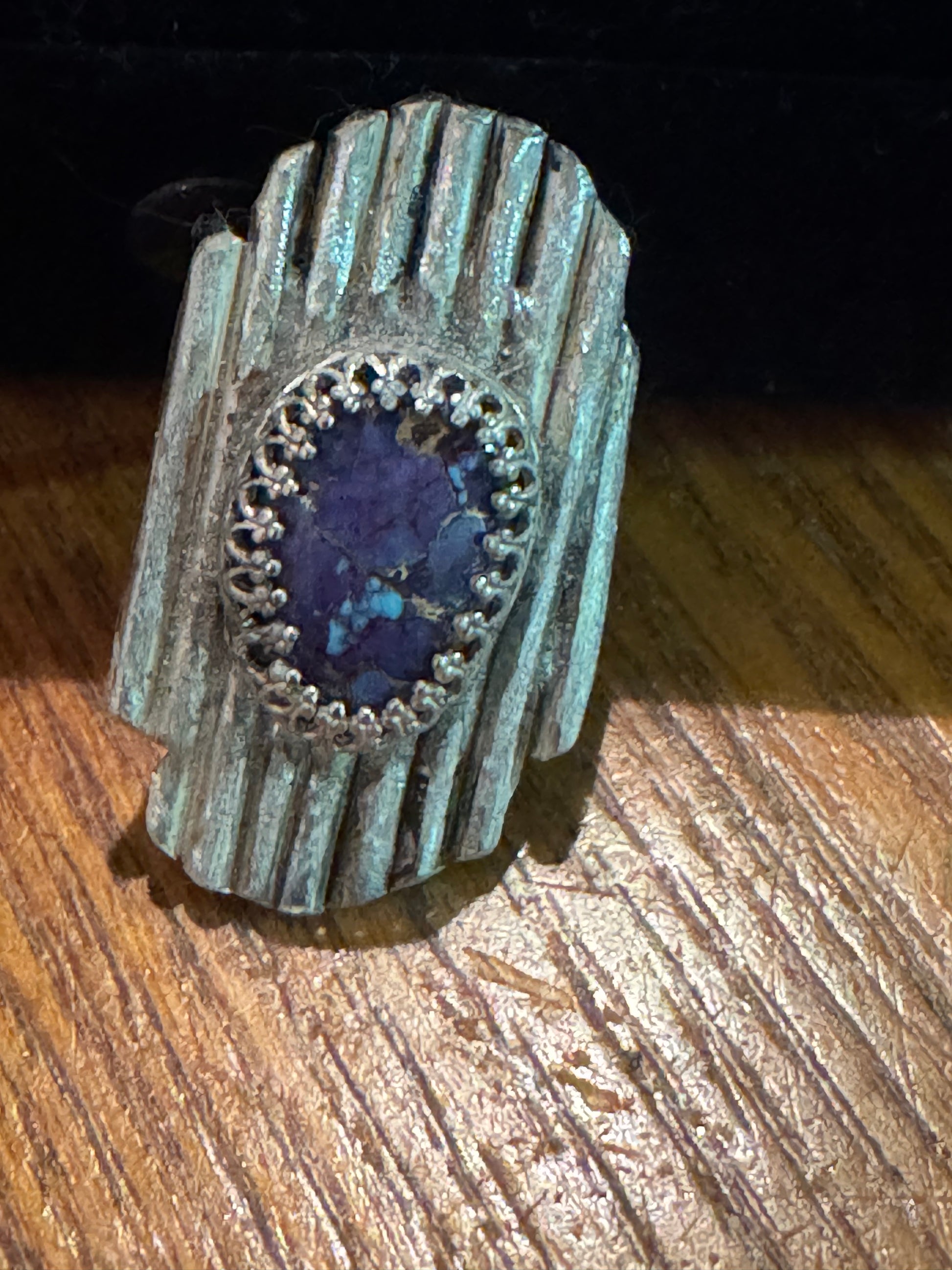 This beauty has been silversmithed just for you. It is a one of a kind. This sterling silver ring with a Mohave stone is sure to be a conversation starter.
